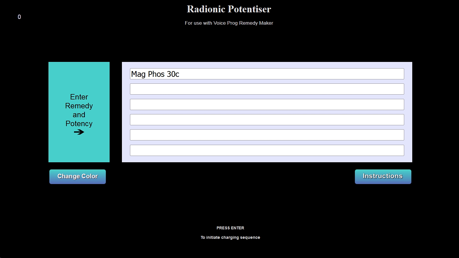 When you have finished entering all the information, please make sure your Voice Programmed remedy maker is placed within 3 feet of the screen, and hit the Enter key on your Keyboard, the timer will count down for 4 seconds and during that time the vibrations of whatever you typed in will be transferred into the temporary memory. There is an audio-visual indication of the countdown. Note: information typed in is not saved by the software, but if necessary you can paste in information you had already typed and saved in notepad.
