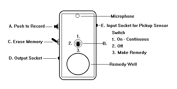 The device can be used to make therapeutic energy programs and these can be very useful if you don't know a suitable remedy for a problem and haven't got the time to look it up. Simply describe the symptoms into the device as clearly as you can and add a potency on the end. In emergency situations the finger of the person requiring that remedy can then be placed in the Remedy Well and the Make Remedy Switch B operated, to transfer that remedy directly into the patient.